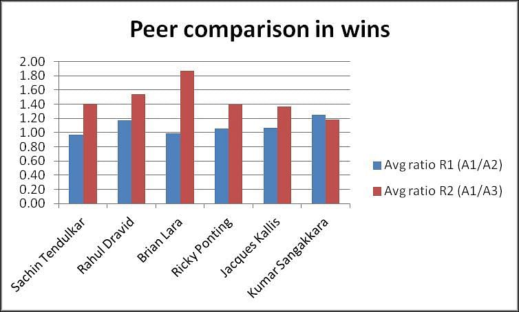 When we analyse the peer performance in wins, we find that Tendulkar’s average in wins is slightly lower than that of his team mates (average ratio R1 = 0.97). This can perhaps be explained by the fact that he was part of a strong batting line-up (Dravid, Laxman and Sehwag) in the second half of his career.