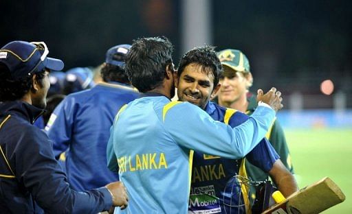 Sri Lanka’s Lahiru Thirimanne (R) celebrates his 100 runs with teammates to win the game against Australia during their one-day international cricket match at the Adelaide Oval on January 13, 2013. Sri Lanka defeated Australia by eight wickets to level the series.