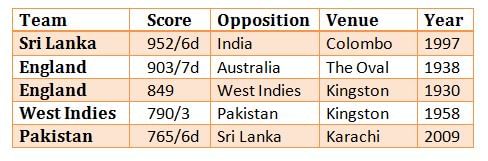 Here is a list of teams that have scored the highest innings totals ever in the history of Test cricket. In a Test match between Sri Lanka and India at the R Premadasa Stadium, Colombo, the home team, in reply to India’s 537 in the first innings, posted a mammoth total of 952/6. Sanath Jayasuriya, who scored a 578-ball 340, made complete use of the flat deck and the innocous bowling attack.