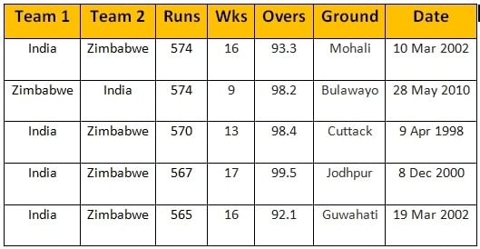 This is a list of the top five match aggregates in ODIs played between India and Zimbabwe.