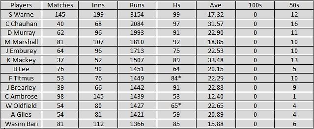 The list given below is headed by none other than Australian legend Shane Warne. He might have broken numerous records as a leg-spinner but one thing he doesn’t have is a three figure score in a Test match, about which he is extremely disappointed. He is followed by a surprise inclusion, former India opener Chetan Chauhan who has to his credit 2084 runs without a single century.