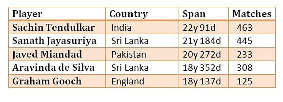 Here is a list of ODI players who have represented their teams in international cricket for the longest period of time. Indian batsman Sachin Tendulkar, whose career spans over 22 years, stands first in the list.