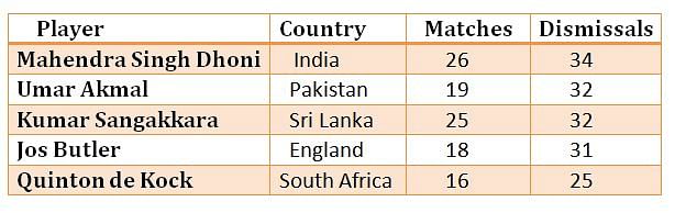 Here is a list of One-Day international wicket-keepers who have been involved in the most number of dismissals in 2013. The count includes both the catches taken and stumpings effected by the keeper. With 34 dismissals in 26 matches, Indian captain Mahendra Singh Dhoni tops the list.