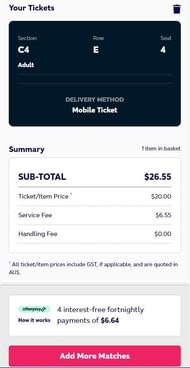 Step 6 - You have been directed to the seat selection page. Select the ticket category, seat and number of tickets. Click on ‘Next’ and you will be directed to the summary of your bill where you can either add tickets of other matches or click on ‘Next’ to be directed to the payment page.