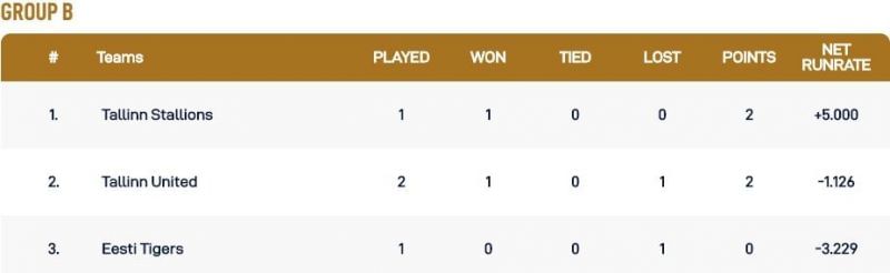 Tallinn United, who also have 2 points, occupy the second position in Group B. They defeated Eesti Tigers in their first match but suffered a huge defeat at the hands of Tallinn Stallions in their final group encounter and are likely to take one of the two semifinal spots from Group B.