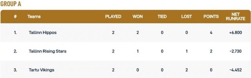 Tallinn Hippos have finished at the top of the points table in Group A with 4 points in their kitty. They got the better of Tallinn Rising Stars and Tartu Vikings in their two encounters to become the first team to qualify for the semifinals from Group A.