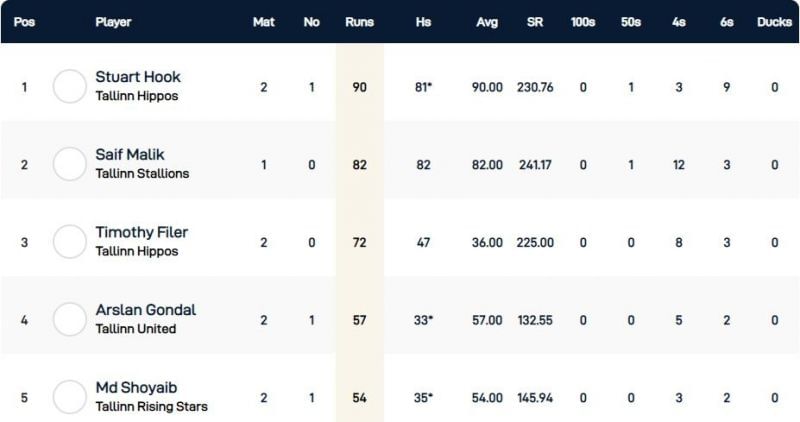 Saif Malik of Tallinn Stallions occupies the second spot in the list of highest run-getters. He scored 82 runs in the only knock he has played, which is also the top score of the league so far. The innings was played at an outstanding strike rate of 241.17 and comprised 12 fours and 3 maximums.