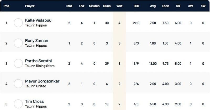 Rony Zaman of Tallinn Hippos and Partha Sarathi of Tallinn Rising Stars are the second most successful bowlers with 3 wickets each. Rony Zaman bagged all his three wickets in the only match he played with his sensational spell of 3/3 being the best figures of the tournament so far. He also has an unbelievable economy rate of 1.50.