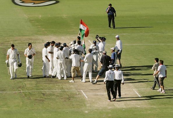 It was more of a moral victory for the Indians, as they denied the Australians a potential world record 17th consecutive victory. Harbhajan Singh sprinted into the ground with the Indian tricolour, paving the way for jubilant celebrations.