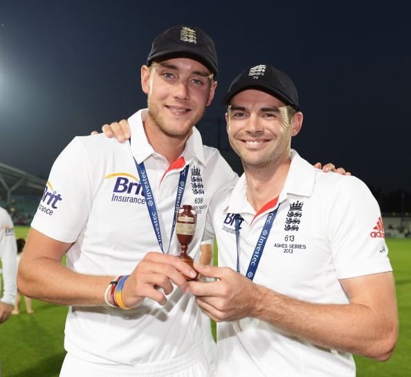 Stuart Broad (L) and James Anderson of England pose with the urn after winning the Ashes during day five of the 5th Investec Ashes Test match between England and Australia at the Kia Oval on August 25, 2013 in London, England. (Photo by Gareth Copley/Getty Images)