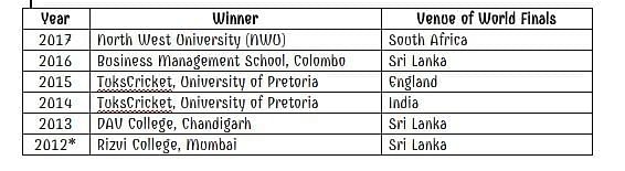 The list of World Champions from the last six editions of Red Bull Campus Cricket is below.