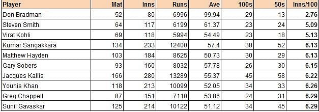 Kohli sits comfortably at the third spot, bettered only by Steven Smith and Sunil Gavaskar, both of whom raked up 23 centuries at similar rates. Other batsmen have varying rates that are different from the rates that they ended up with largely due to indifferent form.