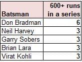 Kohli meanwhile, is in a very elite list when it comes to batsmen who are prolific throughout a series by scoring more than 600 runs in it. Kohli has done this 3 times as of now (692 vs Australia 2014/15, 655 vs England 2016/17, 610 vs Sri Lanka 2017) and is at par with Neil Harvey (Aus), Gary Sobers (WI) and Brian Lara (WI) who did it three times each in their careers.