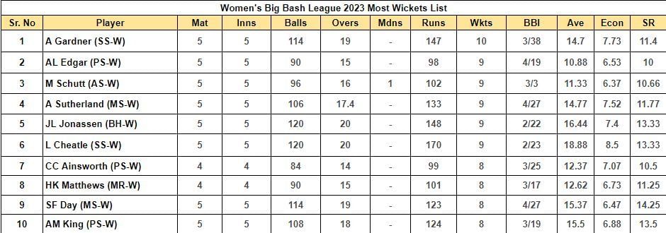 With three wickets in this game, Sixers’ Ashleigh Gardner tops the bowling charts with 10 wickets from five innings at an economy rate of 7.73.