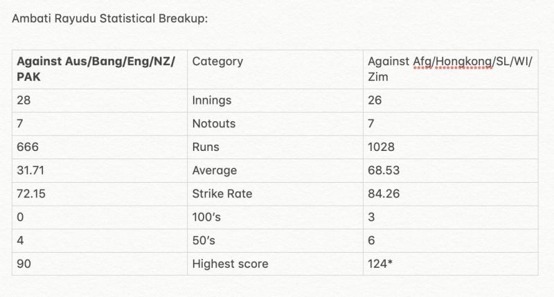 In his defense, one can argue that Rayudu’s career average is close to 50 and has done well whenever given an opportunity. However, digging deeper into his stats will tell a different story.