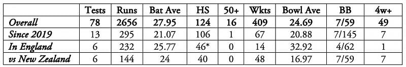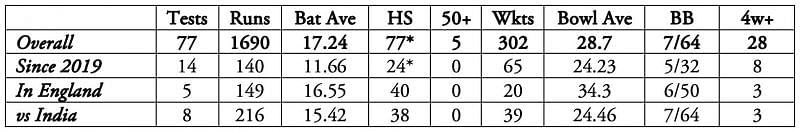 In his 77-Test career, that 77 not out remains his highest score. He hasn’t fully justified his ability as an all-rounder, but time and again, he does contribute with the bat that helps him play decisive roles for the side.