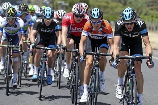 Britain’s Geraint Thomas (2nd R) during the fifth stage of the Tour Down Under in Adelaide on January 26, 2013. Thomas slipped back to 17th place and now lies in fifth place in the general classification, well out of contention for overall honours with only Sunday’s 90-kilometre stage remaining.
