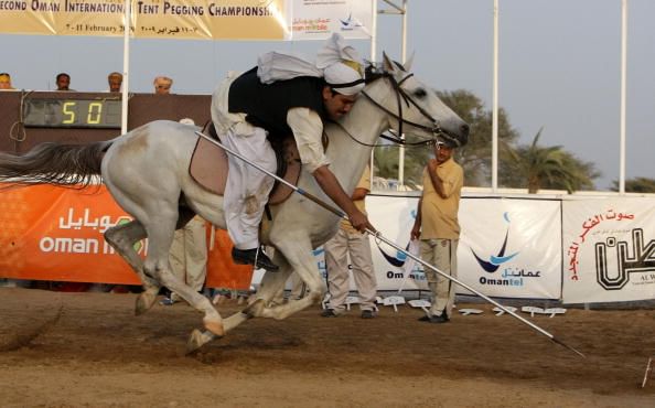 Tent Pegging is a cavalry sport in which a horseman comes galloping and uses a lance to pick up symbolic tent peg placed on the ground. The tracks on which these pegs are placed have markings every 100 meters, while the pegs themselves are placed at an angle. The amount of time the horseman takes to enter and exit the start and finish line is noted by the judges. He is awarded 6 points for picking up the peg and carrying it beyond 15 meters, 4 points for dislodging but not being able to carry it, and 2 points for piercing it.