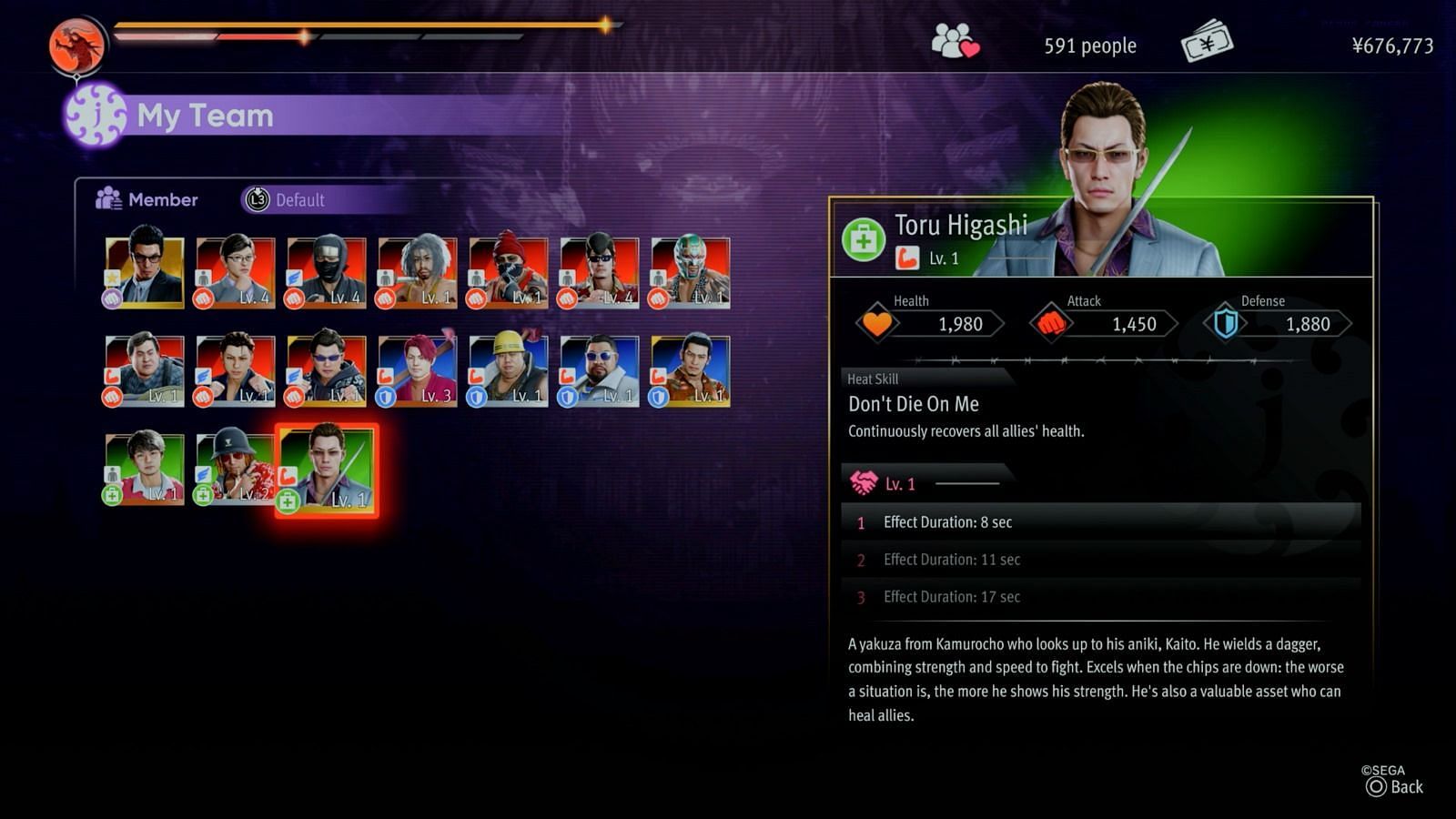 A disciple of Kaito, Toru Higashi embodies his "Aniki's" style with wide, powerful swings and kicks that can work extremely well against a big mob. His ability to heal like Katsuwo, paired with his high HP, makes him an excellent addition to the squad during Hell Team Rumble in Like a Dragon Gaiden.