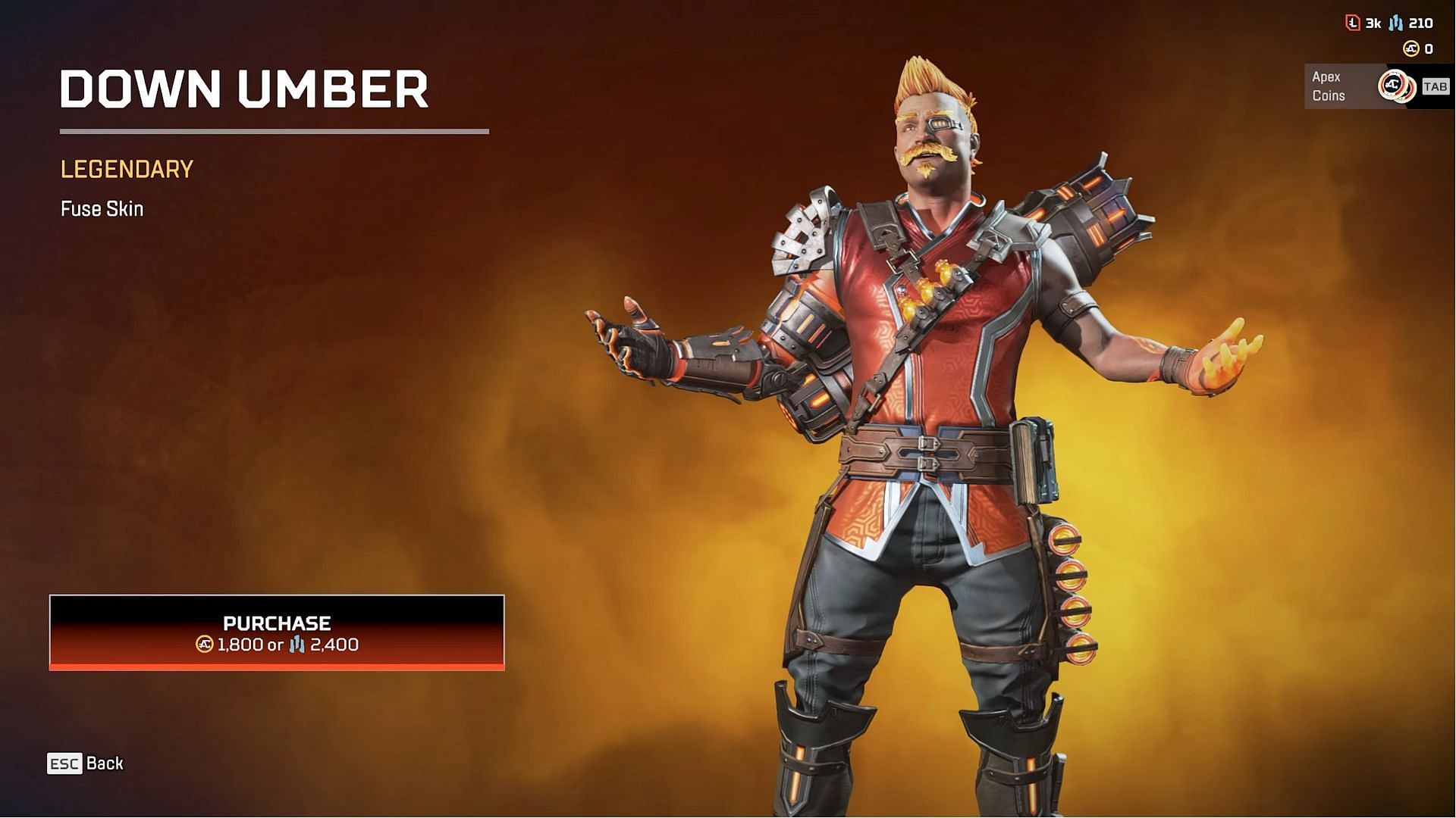 The Down Umber legendary rarity skin showcases the classy side of Fuse. It features Fuse in a red colored dress with golden hair. The developer introduced this skin as a part of the Spellbound Collection Event during season 15 of Apex Legends.