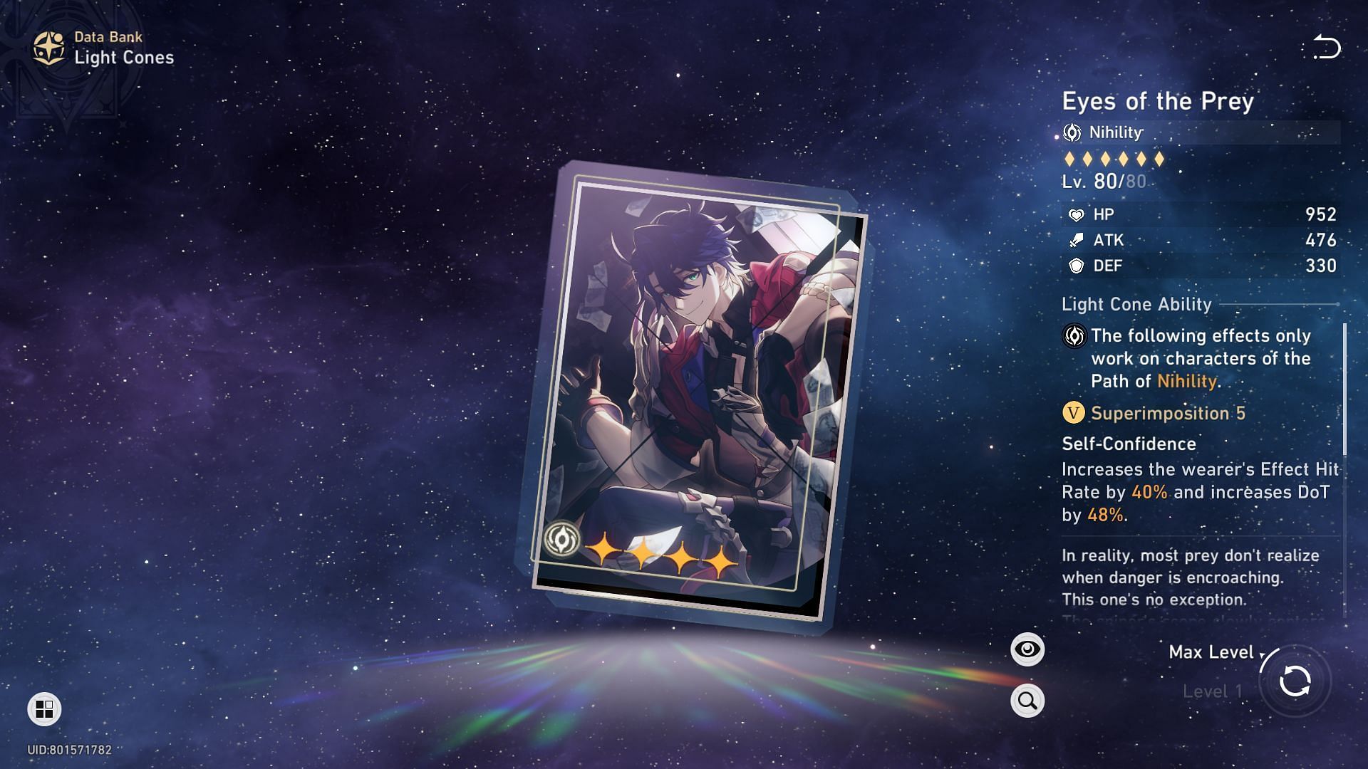 When it comes to the 4-star Nhility Light Cones in Honkai Star Rail, Eyes of the Prey stands out as one of the finest options for Black Swan. It offers a simple passive that increases her Effect Hit Rate and DoT.