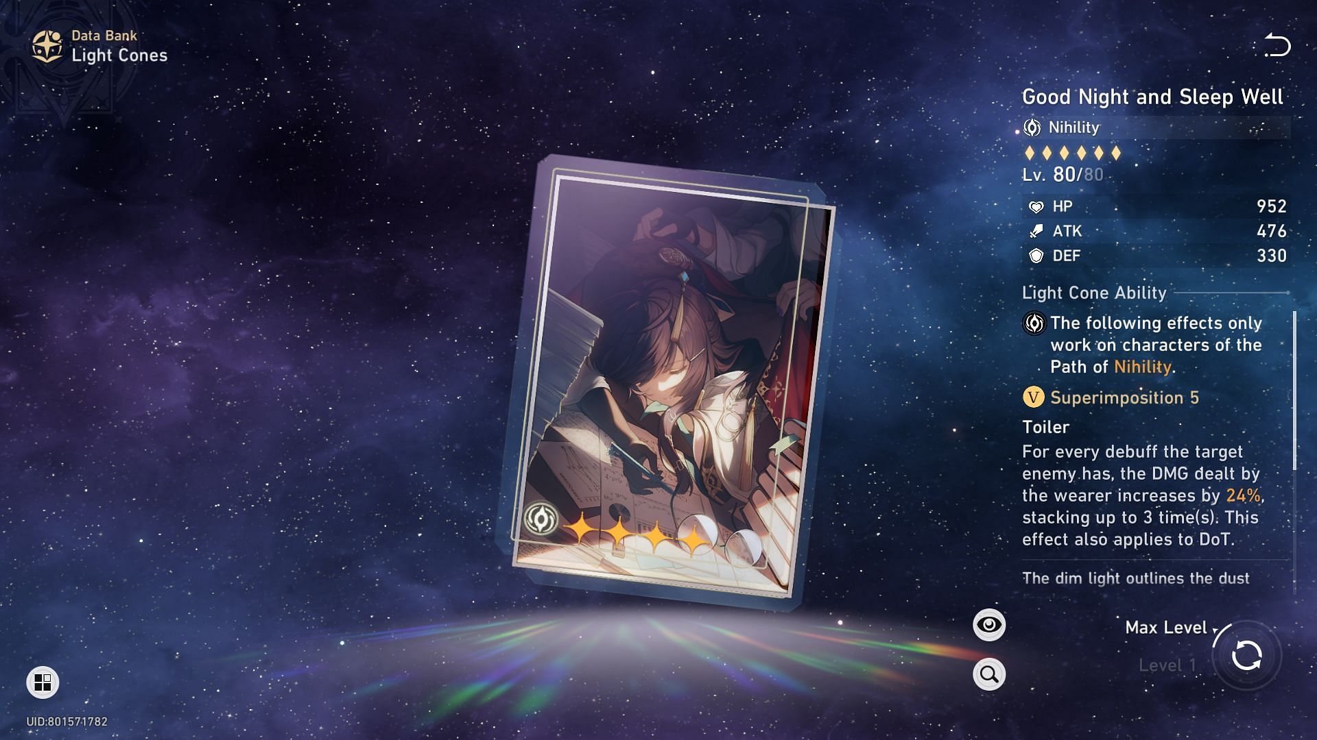 Good Night and Sleep Well is a solid 4-star Light Cone for any Nihility DPS, and Black Swan is no exception. It boosts the wearer's DMG dealt on target by up to three stacks for every debuff applied to them. This effect applies to DoT, which makes it ideal for the Memokeeper.