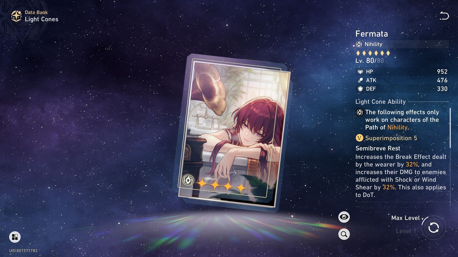 Speaking of effect, the passive enhances the wearer’s Break Effect dealt while boosting their DMG on a target attacked with Shock or Wind Shear. It is clear that Black Swan’s DoT will easily benefit from Fermata's bonus effect.