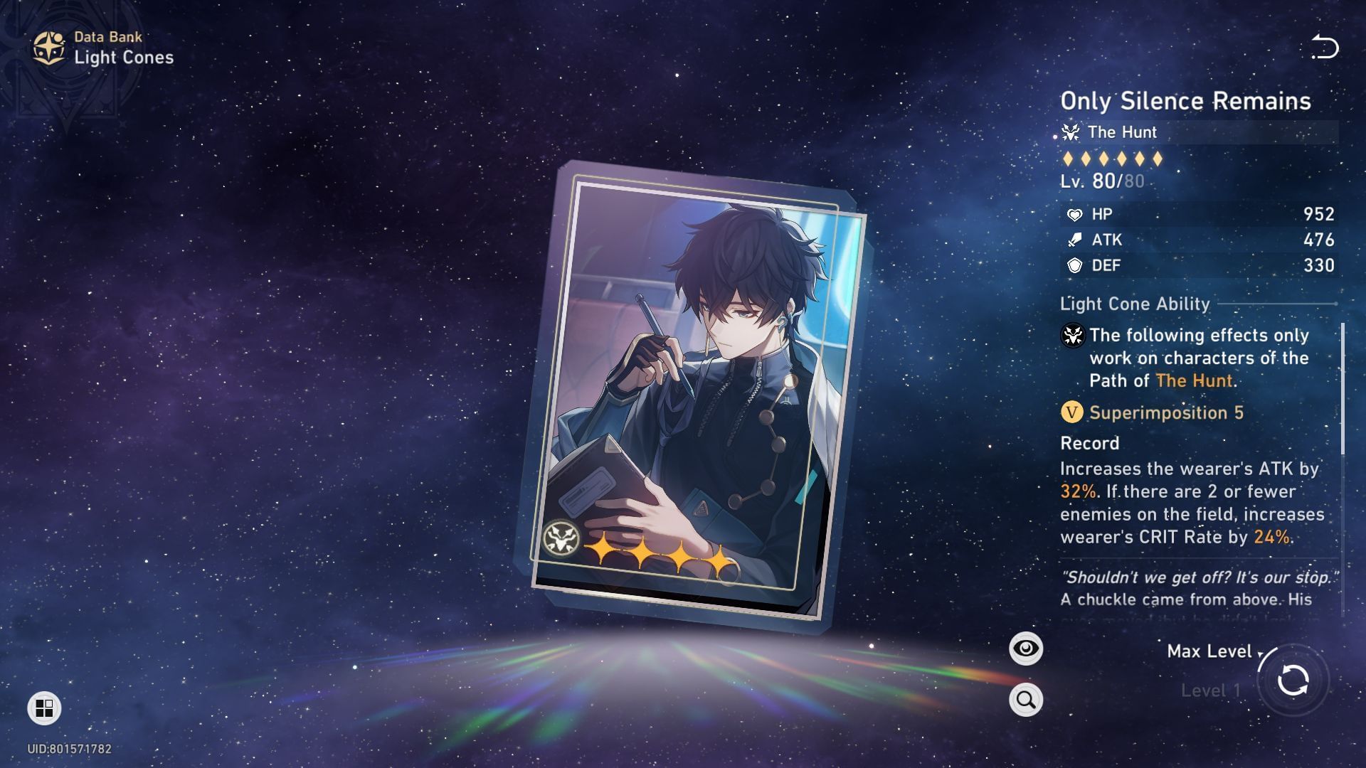 Let’s start with the best free-to-play (F2P) Light Cones for Dr. Ratio, and Only Silence Remains is one of them. It increases the wearer’s ATK by 16%, which goes up to 32% at the maximum Superimpose level. The character’s CRIT Rate is further increased when there are two more active enemies on the battlefield.