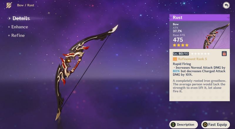 Rust’s normal attack damage buff scales up to 80% at refinement five, which makes Yoimiya’s Blazing Arrows much more powerful.