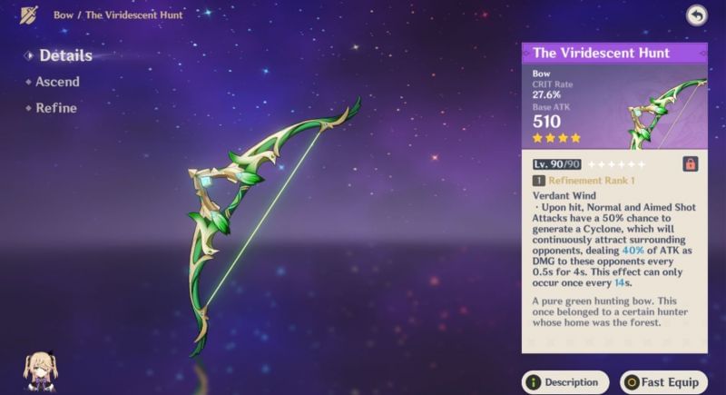 The Viridescent Hunt also gives a CRIT rate boost of up to 27.6%, which works well for almost any main DPS character. With the right artifacts, Yoimiya players, with this bow, should be landing powerful CRITs consistently.