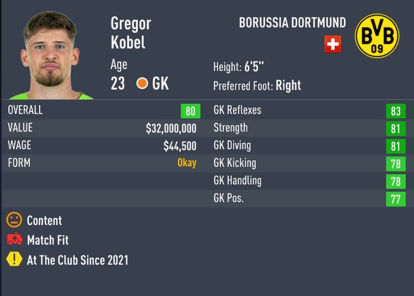 The Swiss goalkeeper shifted over to Dortmund from Stuttgart in the summer of 2021. He replaces international teammate Roman Burki as the starting keeper for the club. Kobel is an excellent budget-friendly option for a goalkeeper in FIFA 22, given the quality he adds to the team's defensive line.