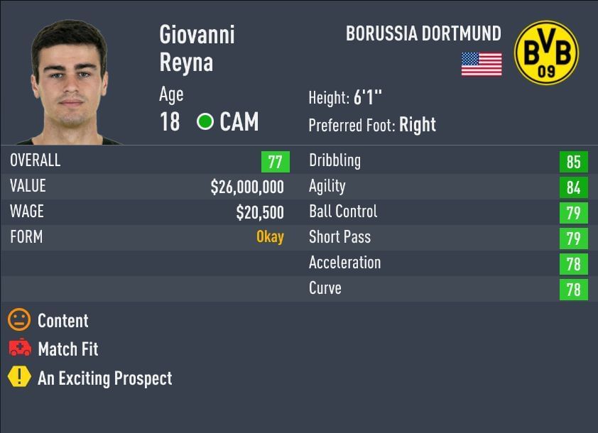 The American midfielder has represented the club in 50 Bundesliga matches so far, and is the youngest ever to do so. He debuted for his country at a very young age as well. Reyna is an agile dribbler (85) who has the stamina (74), vision (78) and shooting (78) abilities to play in several positions in attack and midfield.