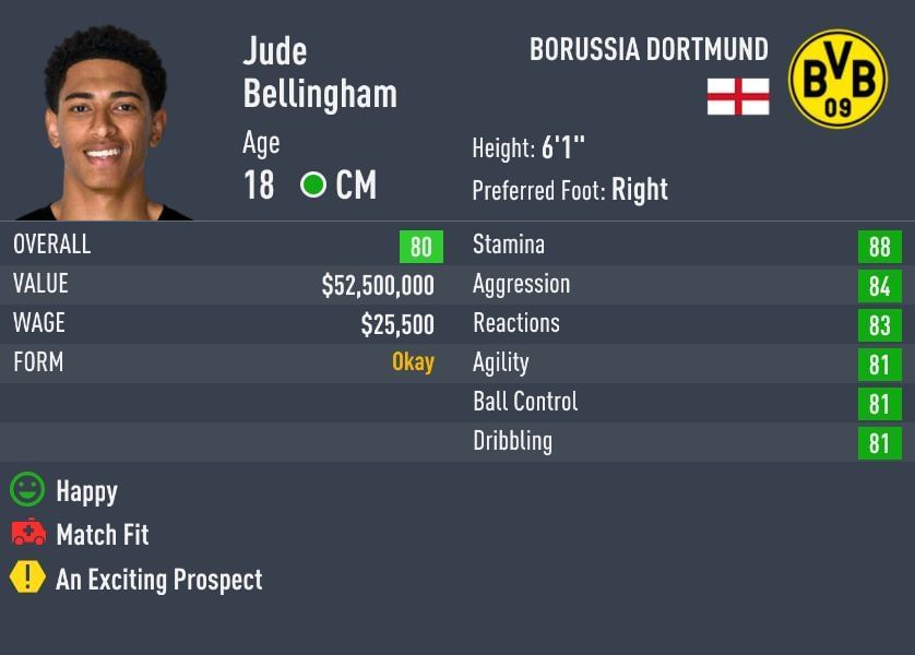 Jude Bellingham is one of the biggest midfield prospects in Career Mode. He blended into the squad immediately after signing, appearing in 29 league matches in his first-ever season in top-flight football. In FIFA 22, he can play in every single outfield position in the game owing to his well-balanced stats and 4-star weak-foot.