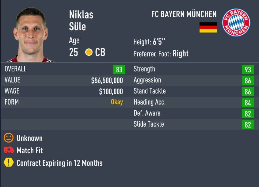 The German centre-back stands 1.95m tall with a well-built physique that helps him establish authority in defense. Sule's monstrous strength (93) paired with aggression (85) are essential attributes in FIFA 22 that players can combine with his heading accuracy (84) and shot power (77) in order to produce goals.