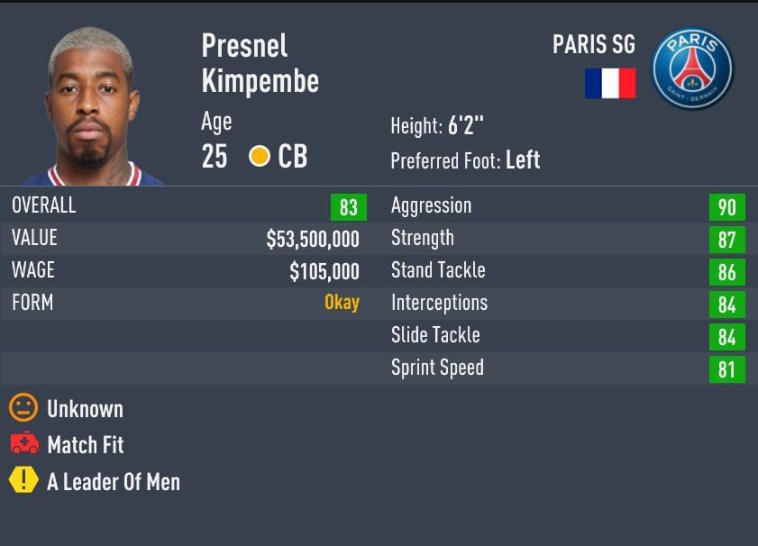 In real life, the Frenchman is forced to sit out of PSG's squad due to Ramos (88) and Marquinhos (87) being the favorites to start games. Career Mode players can use this to their advantage and purchase the player for a good price. Kimpembe's defensive attributes in FIFA 22 are heightened by his physical abilities.