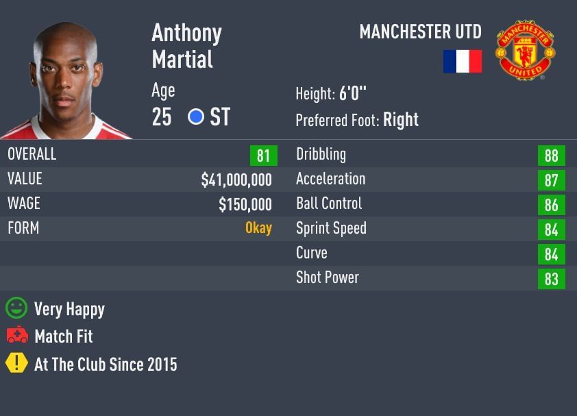 Anthony Martial is one of the meta strikers in FIFA Ultimate Team. In Career Mode, however, he fails to find his place in a squad that already has Ronaldo (91) and Cavani (85) as striker options, with Rashford (85) or Greenwood (78) standing in.