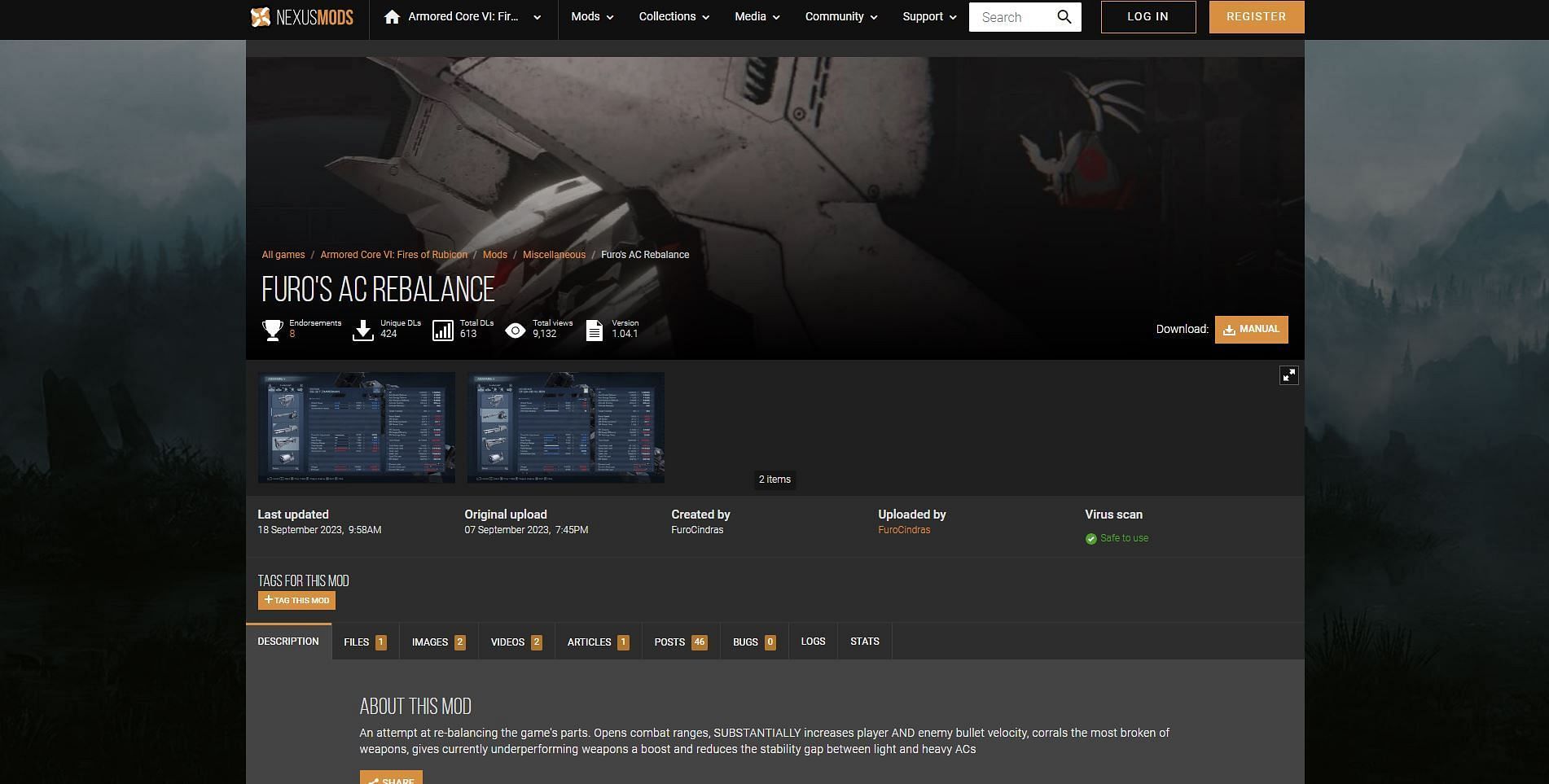 In Armored Core 6, creating the optimal weapon stats that are neither weak nor powerful can be challenging. "Furo's AC Rebalance" improves the stability of numerous mech components like its heads, legs, etc. This includes adjusting the fire rate and damage of specific firearms to either weaken or augment them.