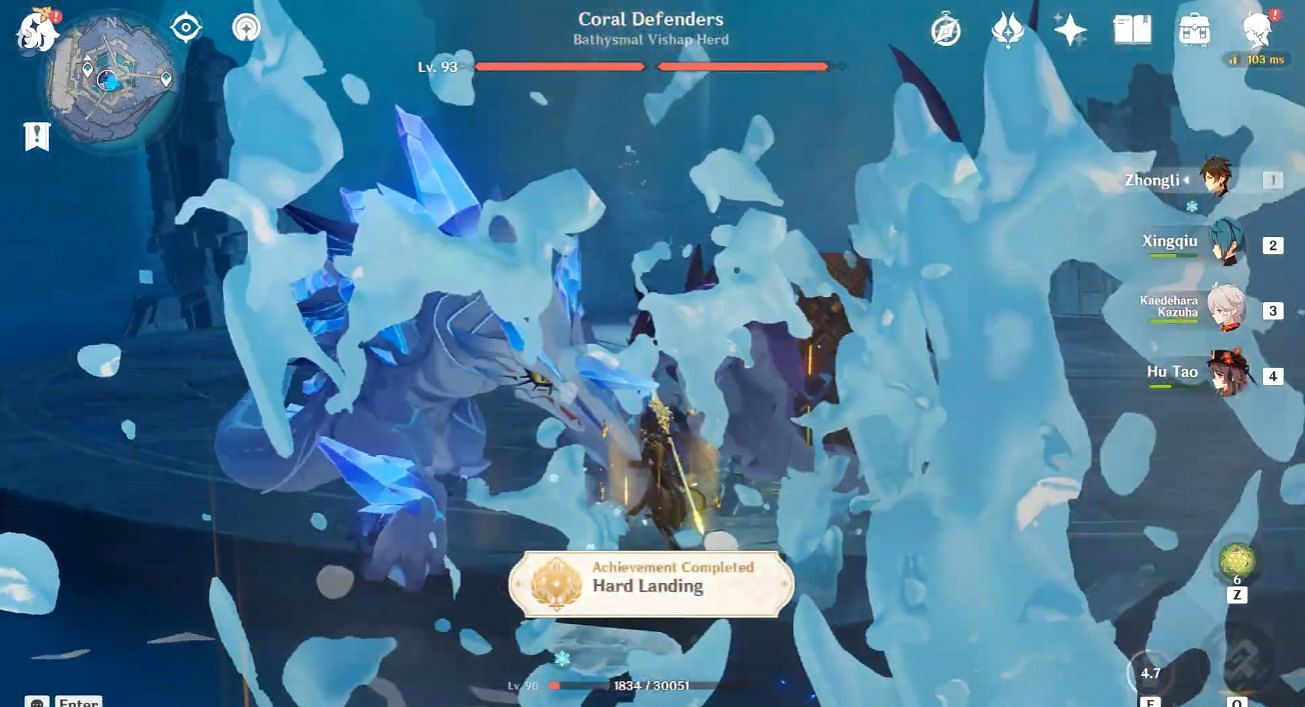 The first achievement, 'Hard Landing,' can be obtained during the fight with Coral Defenders Bathysmal Vishap Herd in Enkanomiya. First, you need to teleport to Enkanomiya Dainichi Mikoshi and fight against the Coral Defender boss.
