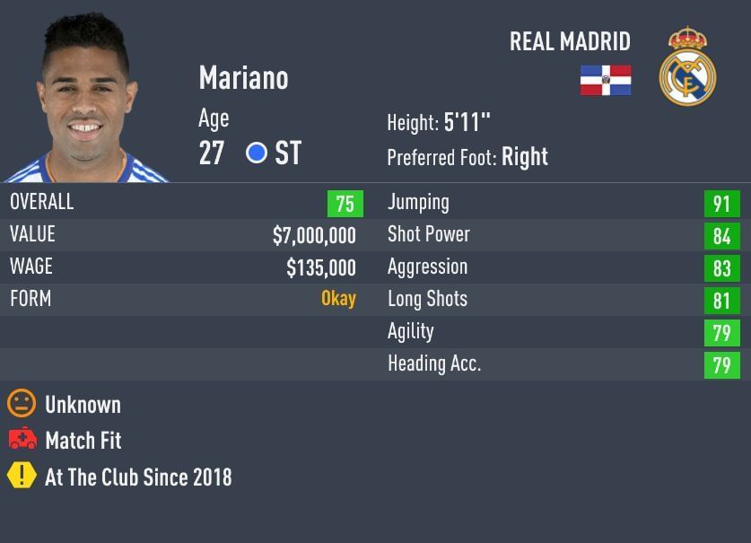 Mariano fits in the Real Madrid squad as the 3rd choice striker, behind Benzema (89) and Jovic (79). The 27-year-old has dormant potential and won't increase in value either. He also has a high-wage structure that drains the club's finances.