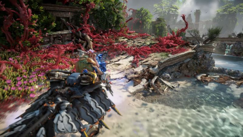 The “Red Blight,” which seems to be a major threat to the world in Horizon Forbidden West, has overrun the lush green flora. What outwardly looks to be a visual treat in the gameplay reveal, is essentially death seeping into post-apocalyptic lives once again.