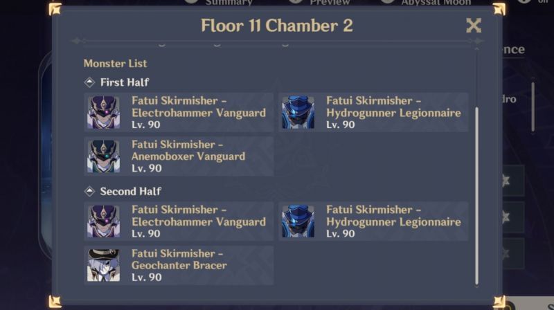 In the second chamber of Floor 11, players have to face two waves of Fatui Skirmishers. Players need a Cryo character for the first half (Hydro skirmishers should ideally be killed before they generate their shield.)