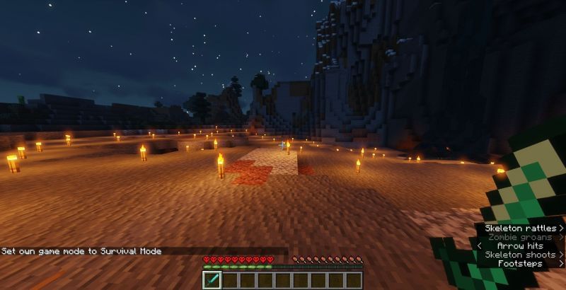 One of the more intrusive settings that players have access to, it can actually be the difference between life and death. To turn on subtitles go into the options menu, click on music and sounds, and change subtitles to on. After a few minutes of play, it becomes extremely evident why subtitles are so important, as they'll warn players of incoming footsteps and mobs as seen above.