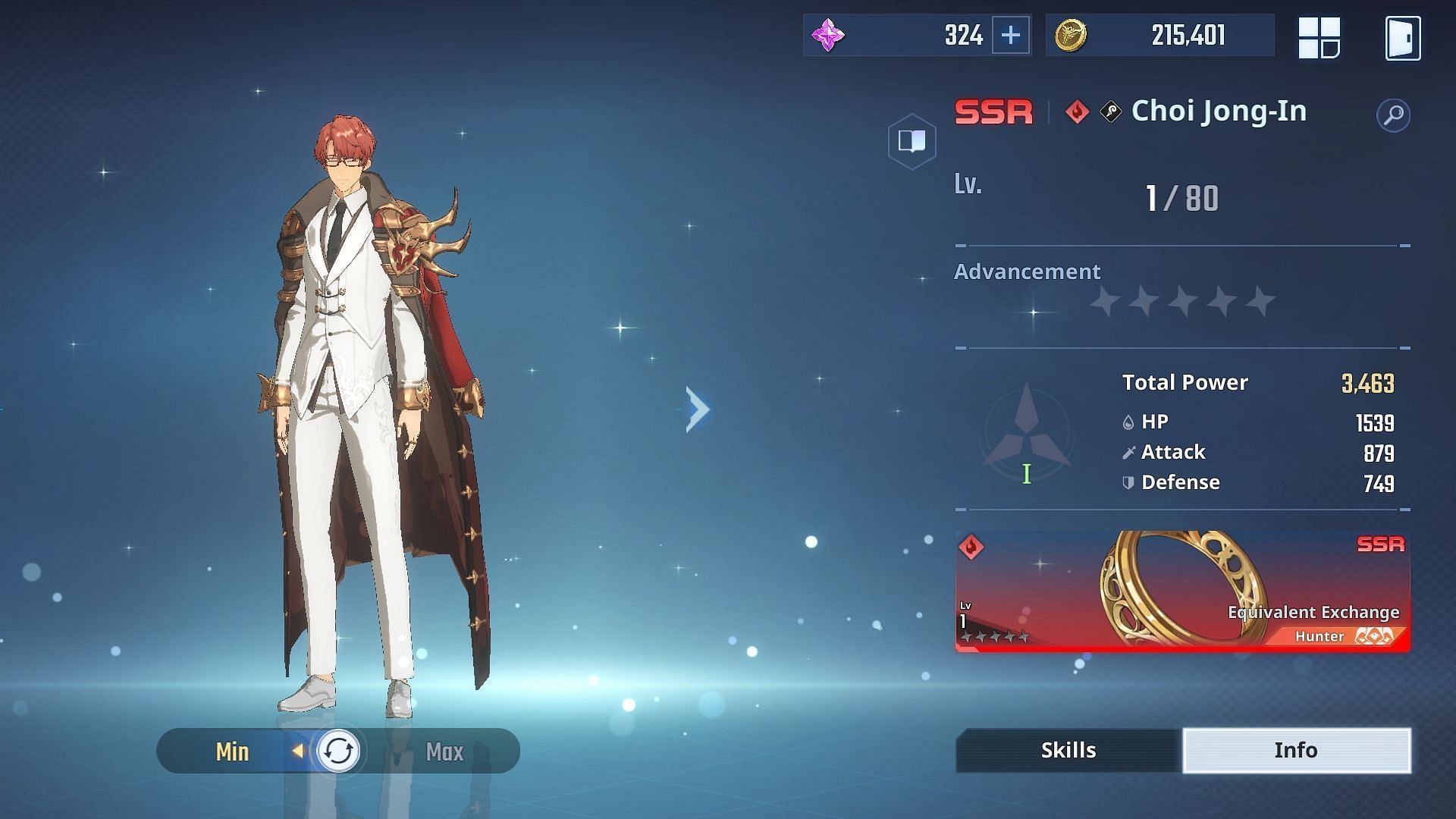 By including Min Byung-Gu as support, players can recover Jinwoo’s HP every 25 seconds. His Support Skill, Judgment of Righteousness, recovers 1% of Min Byung-Gu’s Max HP every second for 10 seconds with Light’s Glimmer effect. Additionally, he can apply the Punishment effect, which makes enemies take 15% more damage for 20 seconds.