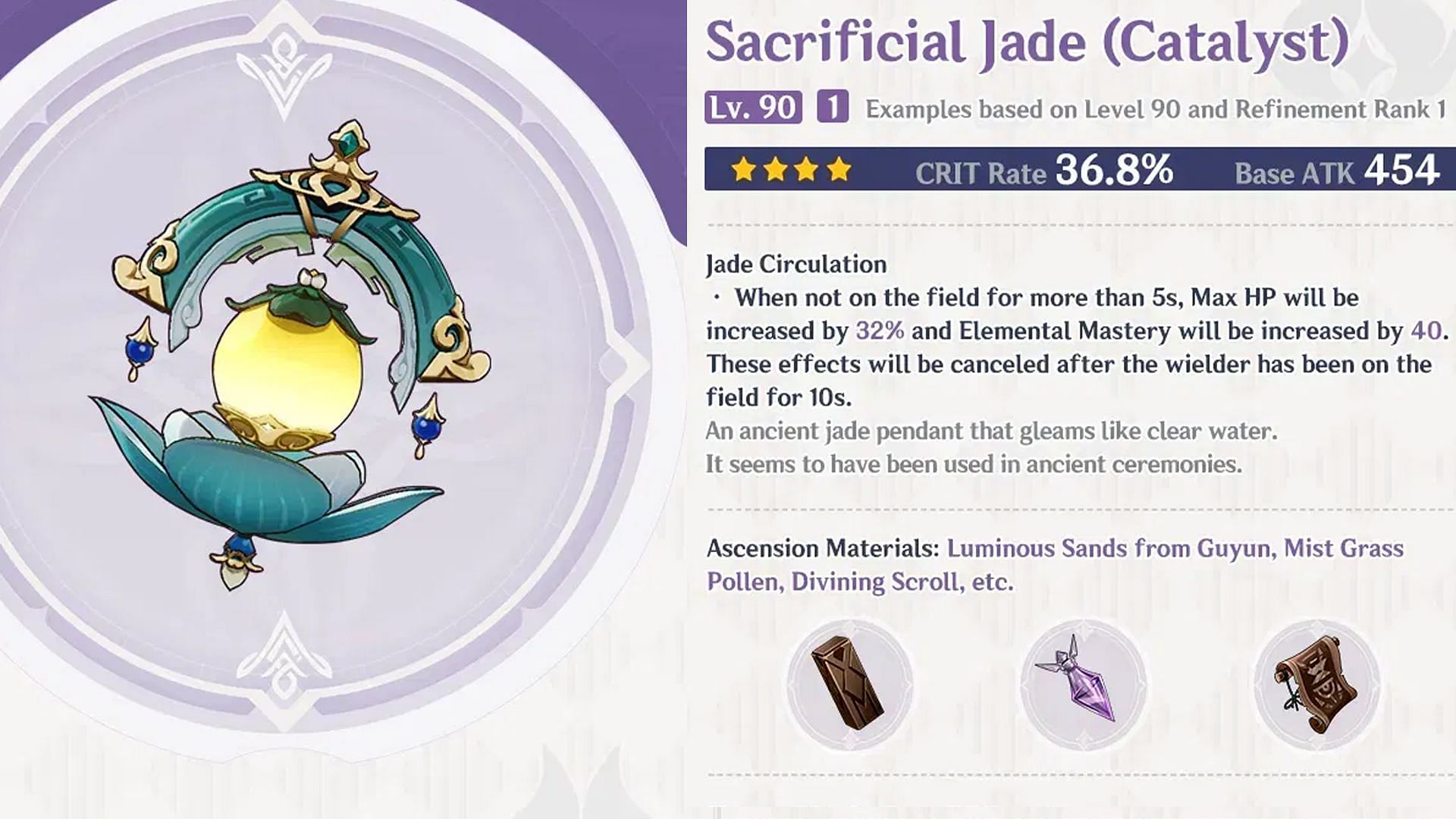 This 4-Star Catalyst is available from the Battle Pass and is Mualani's best 4-Star weapon option. Sacrificial Jade gives a 36.8% Crit Rate boost at Level 90, and its secondary passive increases HP for the user when they are off-field for more than 5 seconds.