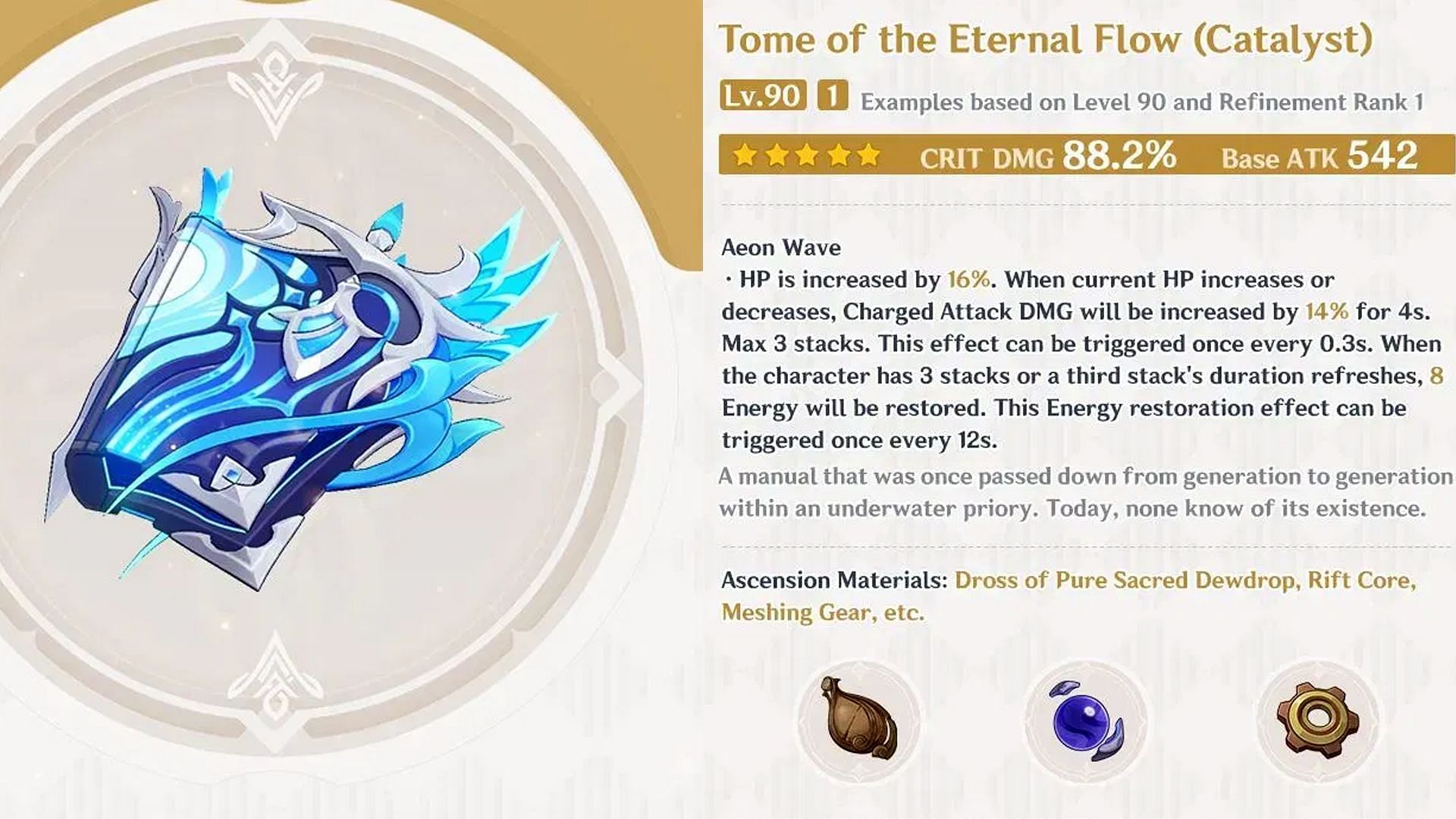 Tome of the Eternal Flow is a 5-Star Catalyst which is Neuvillette's signature weapon. Neuvillette is a DPS character who scales off HP as well, making his signature weapon a good option for Mualani. Having the same Base ATK and 88.2% Crist DMG bonus as Mualani's signature weapon, Tome of the Eternal Flow can be equipped on the Hydro tribe native with great results.