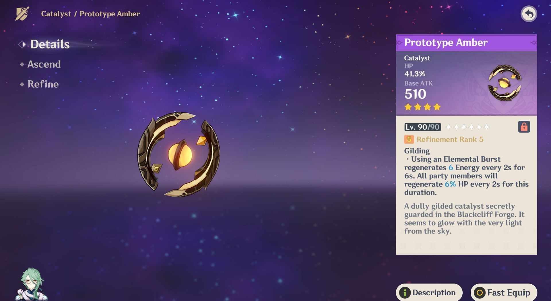 Prototype Amber is a 4-Star Catalyst with an HP% Bonus secondary stat that any characters who scale off Hydro can utilize. With a 41.3% HP Bonus at Level 90, this weapon will be a good 4-Star option for Mualani, as the extra HP will buff her Elemental Skill and Elemental Burst, both of which scale off her max HP.