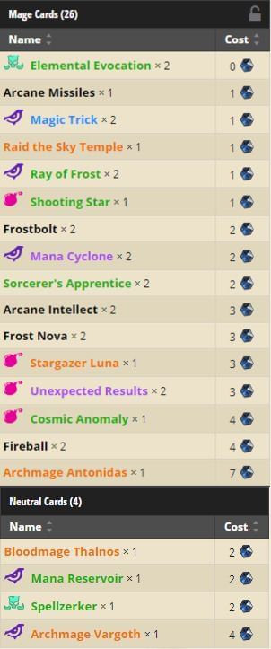 Cards like Mana Cyclone can replenish your hand and give you spells. The discounted spells make it easier to use Mana Cyclone as well. Use Spell Damage to burst down enemies!