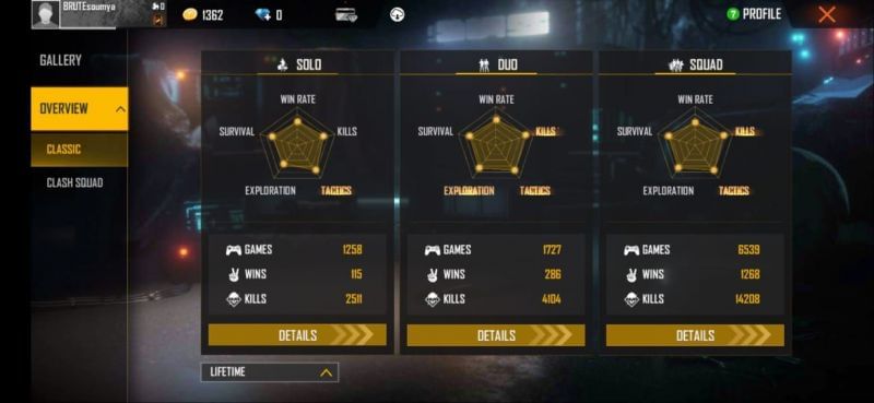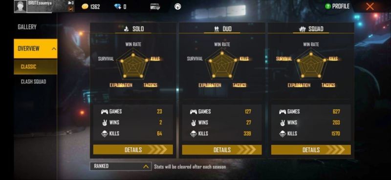 The YouTuber has also won 77 of the 898 solo matches he has played, having a win ratio of 8.57%. He has notched 2267 frags with a K/D ratio of 2.76.