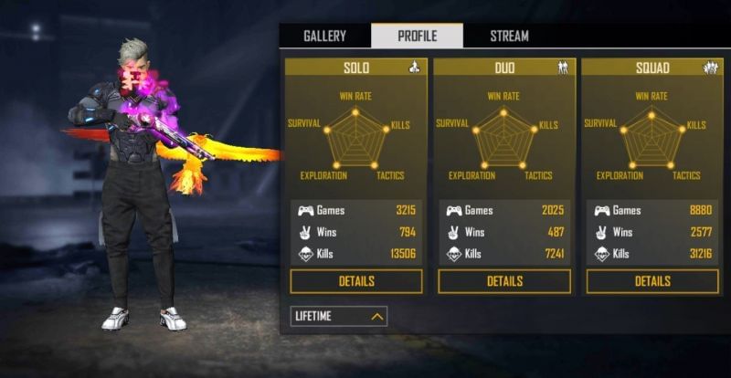 The popular YouTuber has 3215 solo games to his name and has 794 Booyahs, managing a win rate of 24.69%. He has racked up 13506 eliminations and maintained a K/D ratio of 5.58.