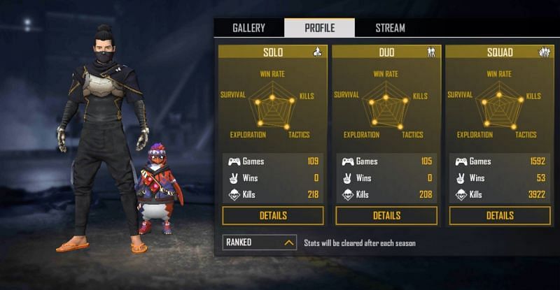 The popular content creator has also won 153 of 2719 solo matches at a win percentage of 5.62%. He has eliminated 5292 opponents for a K/D ratio of 2.06.
